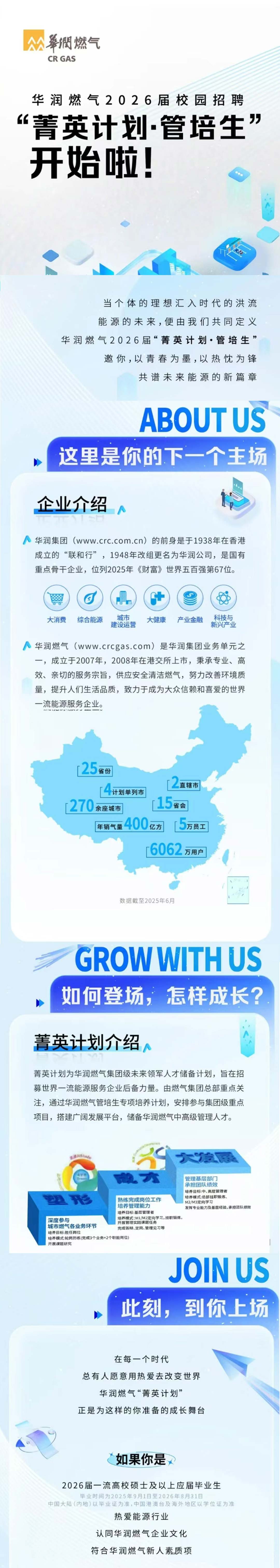 华润燃气控股有限公司(以下简称“华润燃气”)成立于2007年7月,2008年10月底在香港联交所主板上市(股票代码为1193.HK)。目前,业务已覆盖25个省份,包括香港特别行政区、2个直辖市、4个计划单列市、15个省会城市,共计270余座城市,拥有5万名员工,年销气量近400亿方,服务用户数超6000万户。